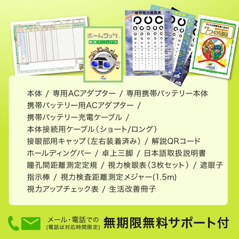 商品構成 ホームワック本体×1、本体専用ACアダプター×1、ホームワック専用携帯バッテリー本体×1、バッテリー用ACアダプター×1、バッテリー充電ケーブル×1、本体接続用ケーブル(ショートとロング)×各1、解説QRコード×1、ホールディングバー×1、卓上三脚×1、瞳孔間距離測定定規×1、視力検眼表×3、遮眼子×1、指示棒×1、視力検査距離測定メジャー(1.5m長)×1、視力アップチェック表×1、生活改善冊子×1