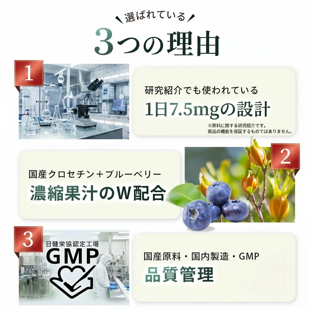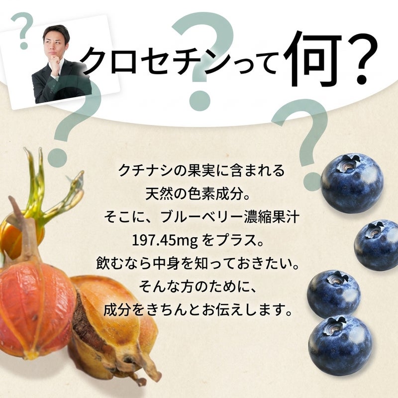 アイサプリメント 国産クロセチン 1.0 サプリメント クロセチン スマホ 読書 近く 見る 楽しむ サプリ クチナシ 天然色素 デスクワーク