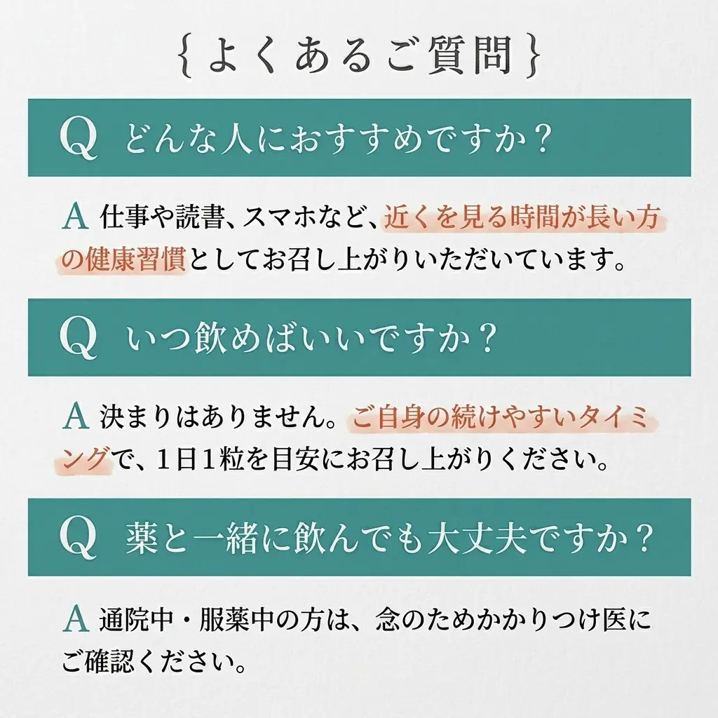 近くを見る作業が多い生活なので、毎日のセルフケアのひとつとして取り入れています。 サプリはいろいろありますが、結局は無理なく続けられるもののほうが自分には合っています。こちらはその点で取り入れやすく、日々の流れの中で自然に続けやすいです。内容がわかりやすいのも安心感がありました。