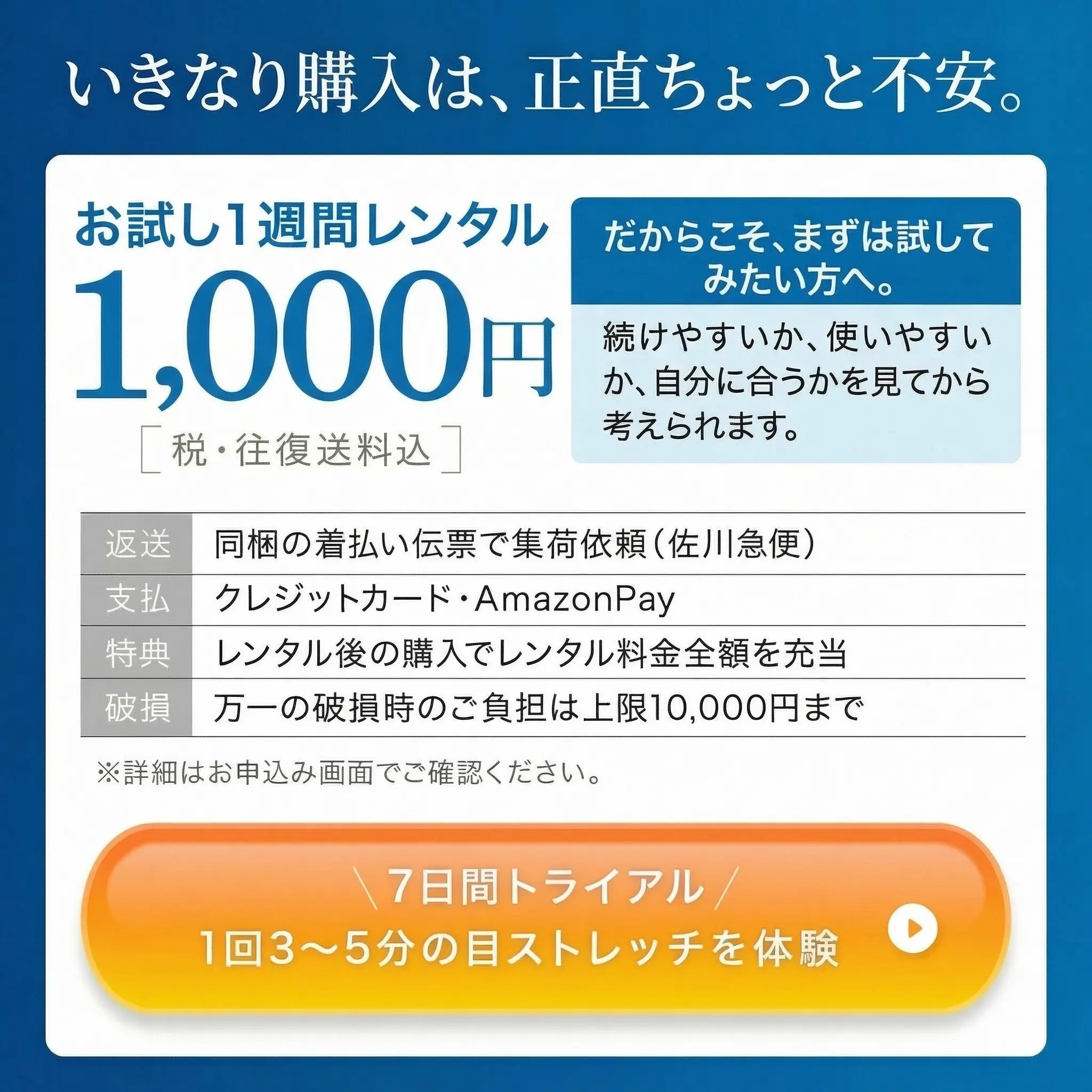 ホームワック関連 【往復送料無料】 視力回復 トレーニング 子供 ホームワック1週間お試し2,200円レンタル クレジットカード AmazonPay決済限定 当店限定価格 支払い方法限定 通常価格 ¥ 2,200 のところ 販売価格 ¥ 500 税込 詳細を見る お気に入りに登録する
