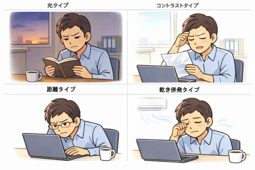 | 光タイプ | 夕方・暗いと急に読めない/老眼初期っぽい | 手元ライトを足す(眩しさが増えたら位置を変える) | 明暗差を縮める(部屋と画面の差を小さく) |