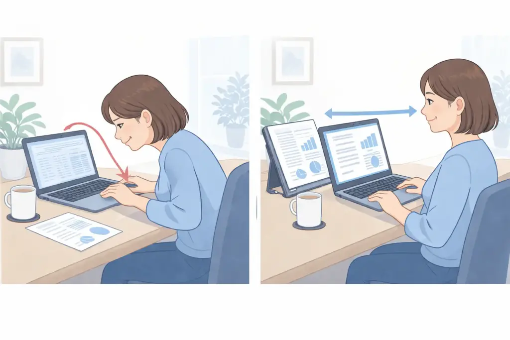 見比べるたびに視線移動とピントの切り替えが増えるため、目にも体にも負担がかかります。