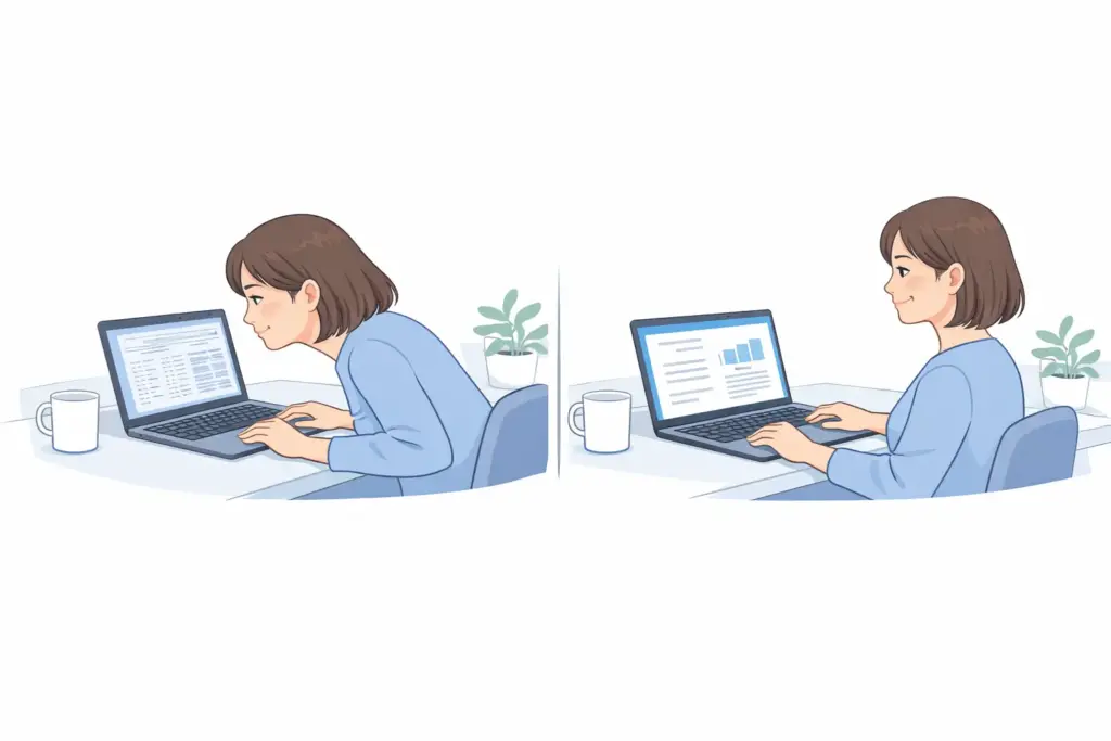 ブラウザや資料作成ソフトの表示倍率を少し上げて、1日だけでも試してみると違いを感じやすくなります。