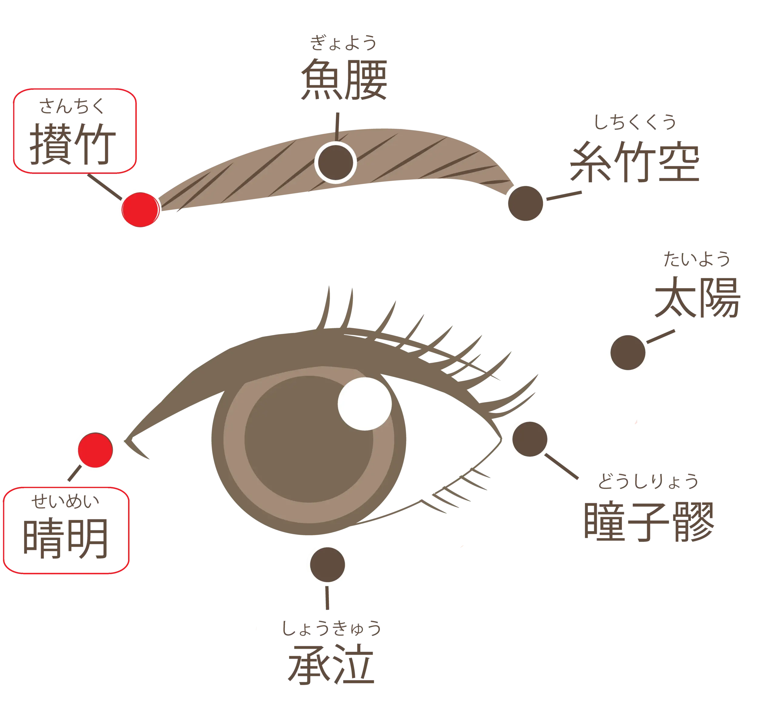 攅竹(さんちく)や太陽(たいよう)などを、痛気持ちいい程度に軽く押して、力を入れすぎないようにしましょう。